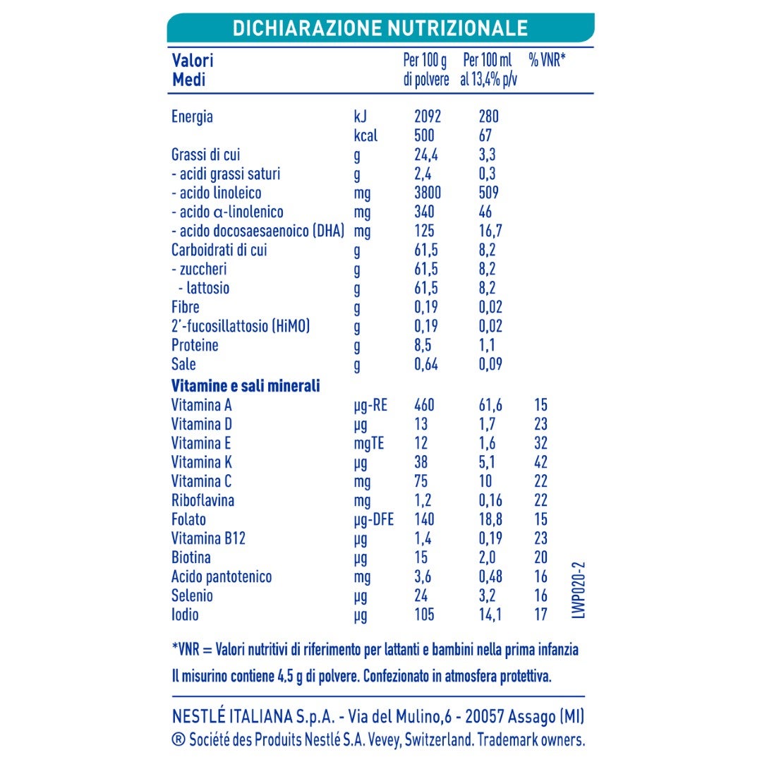 LATTE scremato, LATTOSIO, siero di LATTE parzialmente demineralizzato e frazionato in polvere, oli vegetali (girasole, colza), sali di calcio dell'acido citrico, sali di sodio dell'acido ortofosforico, citrato di potassio, cloruro di potassio, emulsionante: lecitine (di SOIA), olio derivato dalla microalga Schizochytrium sp, correttore di acidità: acido citrico, L-fenilalanina, 2’-fucosillattosio (2’-FL) (contiene LATTOSIO), L-ascorbato di sodio, cloruro di magnesio, sali di potassio dell'acido ortofosforico, L-leucina, L-isoleucina, L-triptofano, L-istidina, solfato ferroso, solfato di zinco, acetato di DL-alfa-tocoferile, nicotinamide, D-pantotenato, calcio; solfato rameico, mononitrato di tiamina, acetato di retinile, riboflavina, cloridrato di piridossina, solfato di manganese, ioduro di potassio, acido folico, selenato di sodio, fillochinone, colecalciferolo, D-biotina, cianocobalamina.